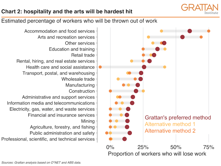 The second source of information is a set of estimates by Grattan researchers of the extent to which jobs are under threat in each of 88 industries in Australia.