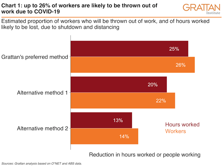 Our preferred method finds that about 26% of workers – 3.4 million Australians – could be thrown out of work as a direct result of the shutdown and social distancing.
