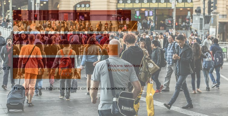 Nonetheless our estimates strongly correlate with the share of firms which report that they have reduced worker hours in response to COVID-19. If all of those 3.4 million Australians moved from being “employed” to “unemployed”, the unemployment rate would spike to 30%. But this extreme outcome won’t happen, because not everyone who loses work will cease being categorised as “employed”, and not everyone who ceases being “employed” will become “unemployed” – some will stop looking for work.